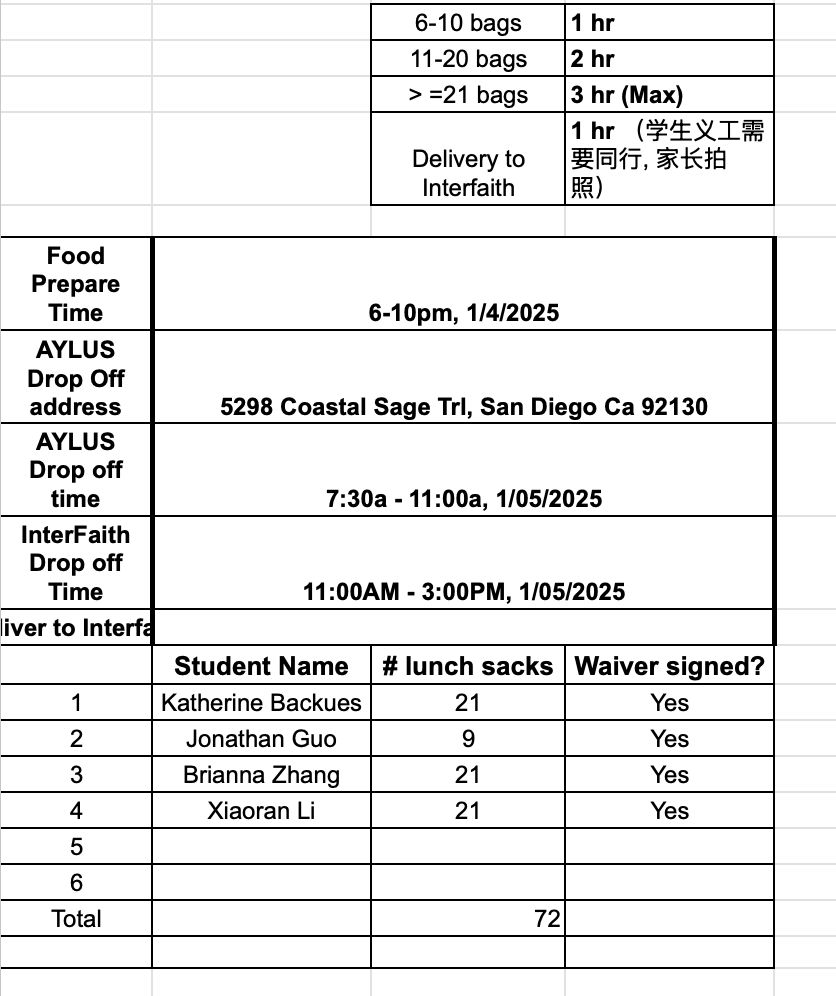The following 4 AYLUS volunteers participated and made 72 sack lunches 1/5/2025 and delivered all of them to Interfaith Community Services on the day: