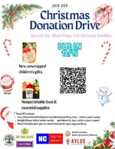 During 2025 Christmas season, we collected new, unwrapped children’s gifts as well as nonperishable food and essential supplies to support families in need. We partnered with other organization for the Christmas Donation Drive and helped spread joy, shared hope, and lifted up local families this holiday season. Members worked on the donation are: