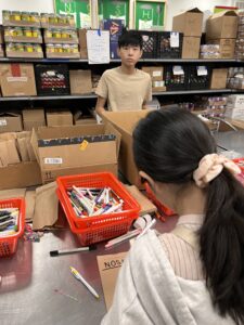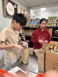 Upon our arrival at NOSH, we immediately got started with drawing on the KFIP bags, which are handed out to people that have kids who need lunch. These KFIP bags include either ramen or mac and cheese, plus a side of chips. We made the bags appealing, then packed them, then stocked the shelves with these bags. While we were doing this, we stayed organized and meticulous by counting how many bags were made and packed. Additionally, we kept bringing boxes of packed food like ramen and chips over to our packing table and prepacked bags from upstairs. Overall, we had a great time helping people in need and would definitely return.