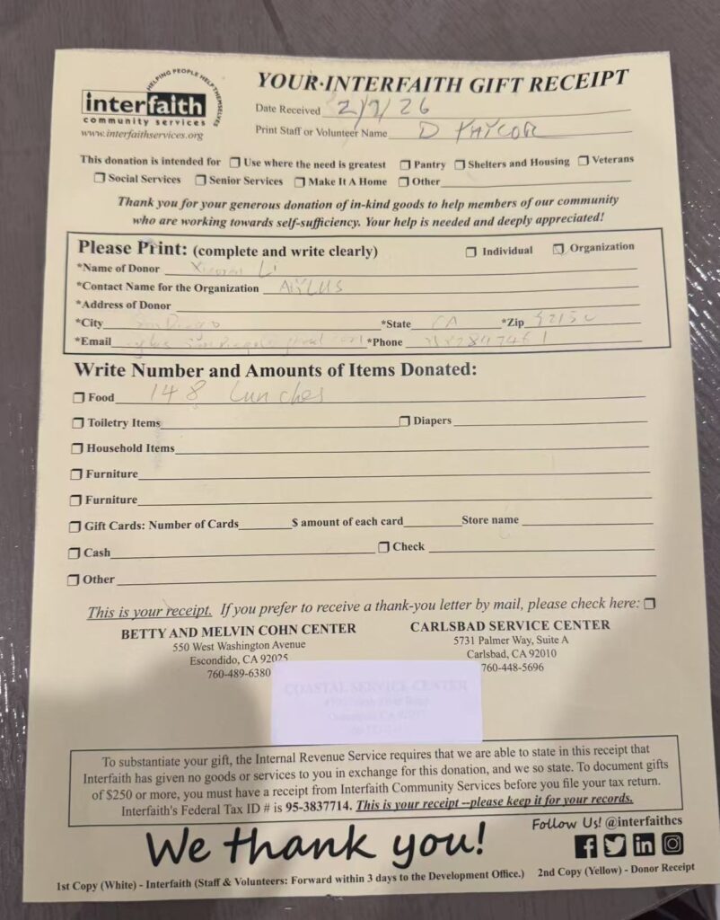On February 2, 2025, AYLUS San Diego Branch made sack lunches for Interfaith Community Services.