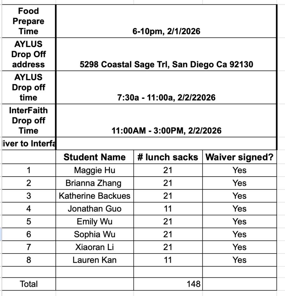 The following 8 AYLUS volunteers participated and made 148 sack lunches 2/2/2025 and delivered all of them to Interfaith Community Services on the day: