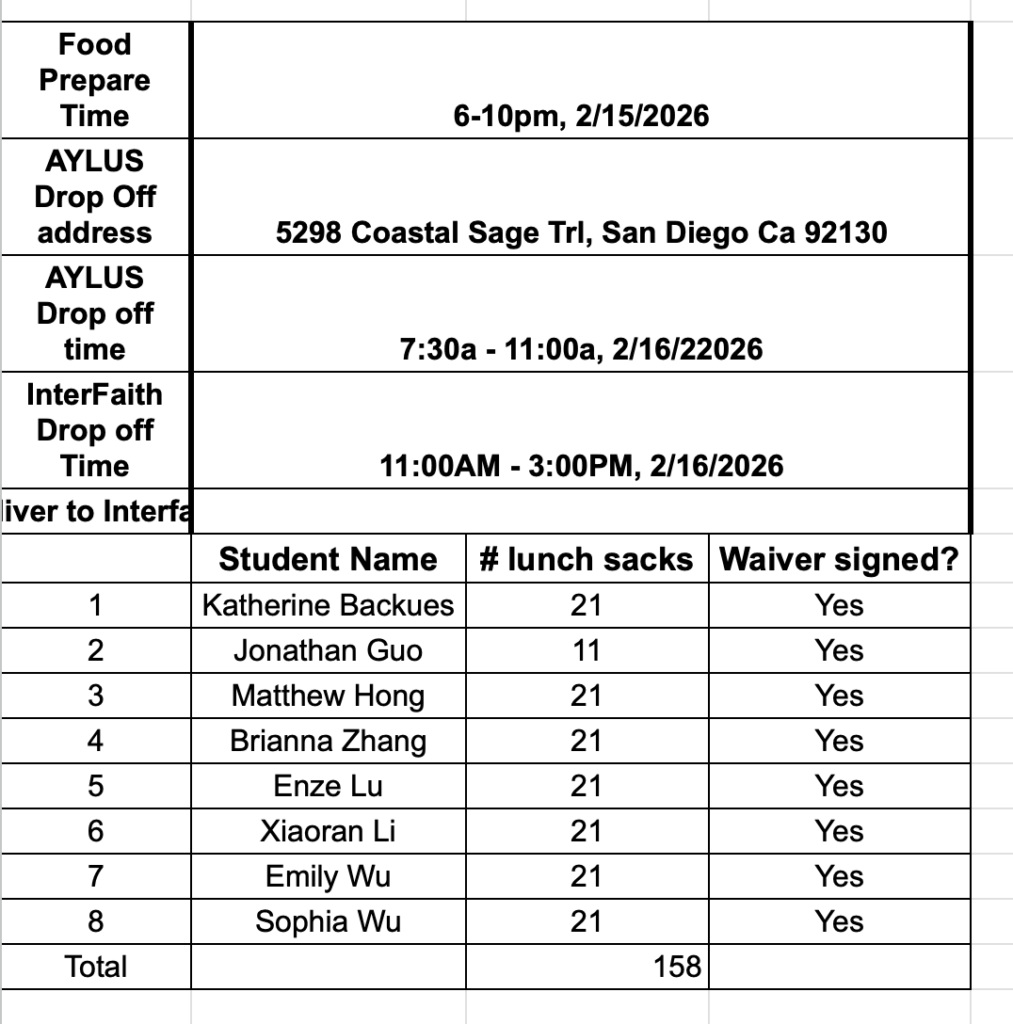 The following 8 AYLUS volunteers participated and made 158 sack lunches 2/23/2025 and delivered all of them to Interfaith Community Services on the day:
