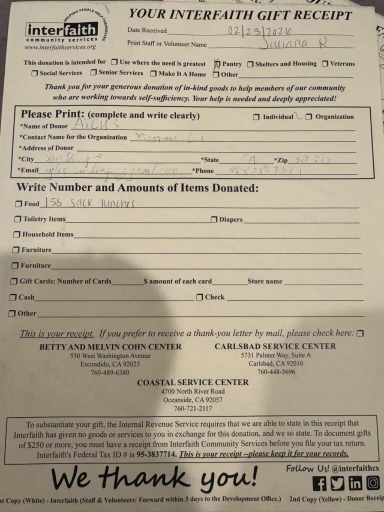 On February 23, 2025, AYLUS San Diego Branch made sack lunches for Interfaith Community Services.