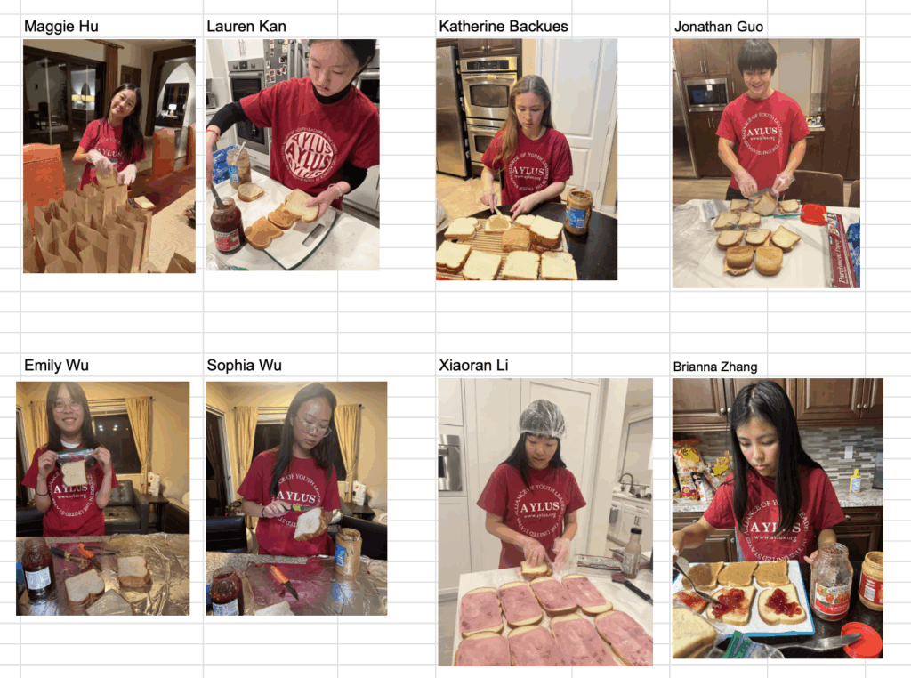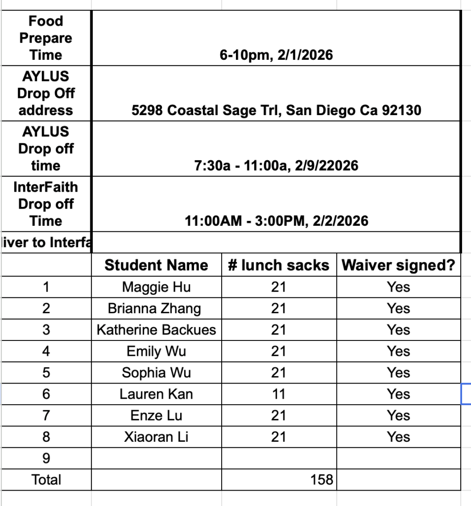 The following 8 AYLUS volunteers participated and made 158 sack lunches 2/9/2025 and delivered all of them to Interfaith Community Services on the day: