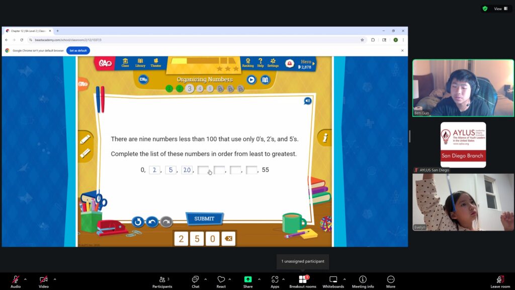 Beast Academy is a mathematics program for elementary and middle school students, and highly qualified high school volunteers will be teaching the Beast Academy curriculum. Currently at the San Diego Branch, enough students have signed up for this course for it to be offered in five levels: 1, 2, 3, 4 and 5. Through tutoring sessions hosted virtually over Zoom, our volunteers teach students numerous informative mathematical concepts that help to bolster problem-solving skills and improve their mathematical knowledge.