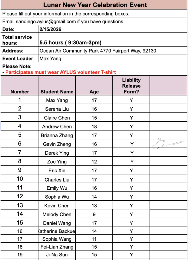 To celebrate traditional Lantern Festival, Huaxia Chinese School organized a new year celebration event at Miramar Collere-Hourelass Park on Feb 15, 2026. AYLUS San Diego Branch students volunteered in helping set up this event and organized Charity Sales to raise fund and support project “Library with love” to ship books from US to East Africa.