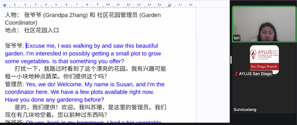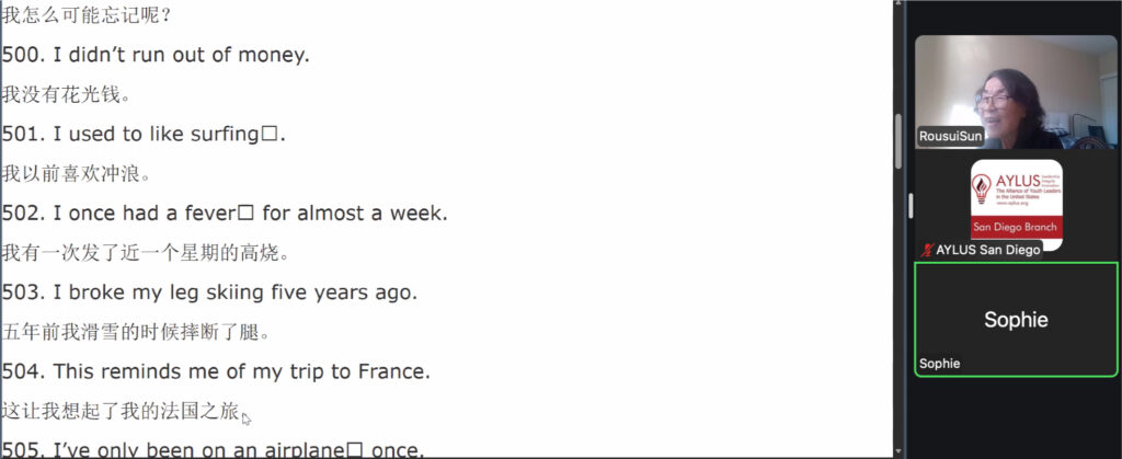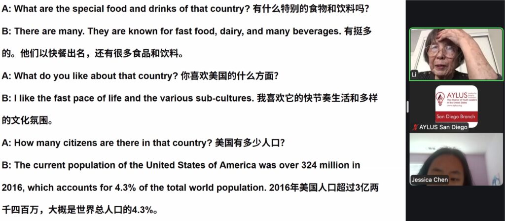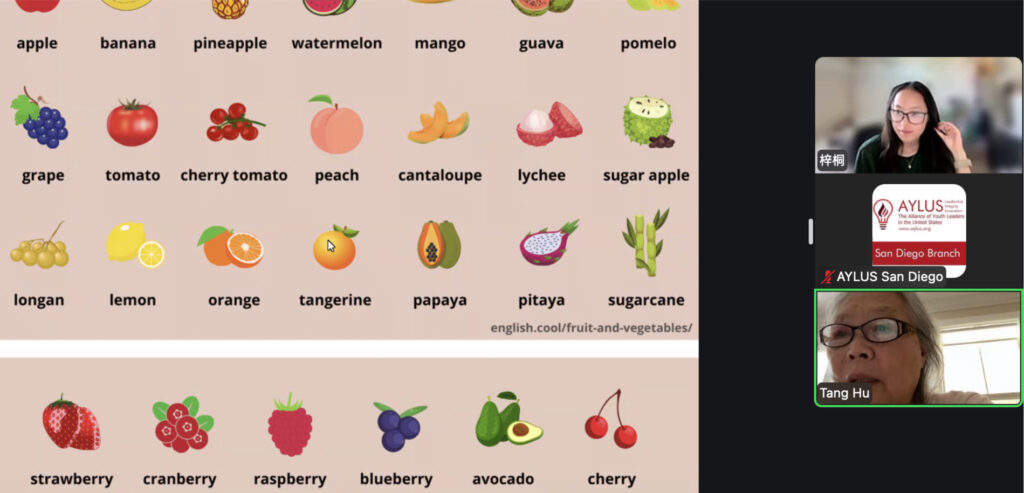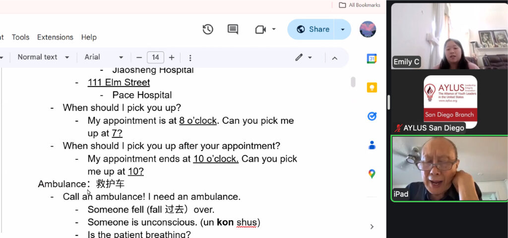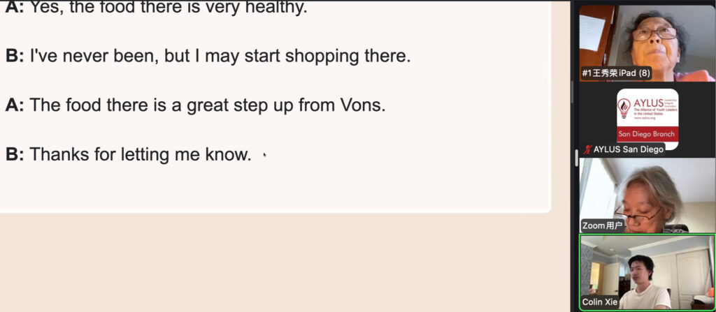 On Febuary 28 and March 1, members of the AYLUS San Diego branch participated in the 298th online English for the Elderly activity. The goal of this activity is to help elderly men and women from China learn the basics of English so that they’re able to use them in their daily lives.