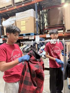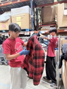 On Sunday, March 15th, from 10:00 am to 1:00 pm, members of the San Clemente Branch of AYLUS, Tylon Zhou and Shuqi Hu volunteered at Mercy Warehouse #14 to organize clothing. They signed in when they arrived and got to work right away.