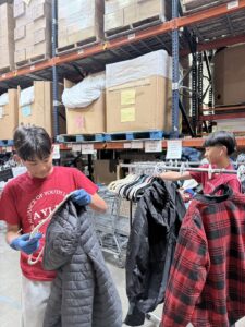 The task they were assigned was to sort and organize men’s and women’s winter jackets, pants, and shirts into their designated sections so shoppers could find what they needed more efficiently. They worked together to arrange the clothing on racks, helping the warehouse stay organized.