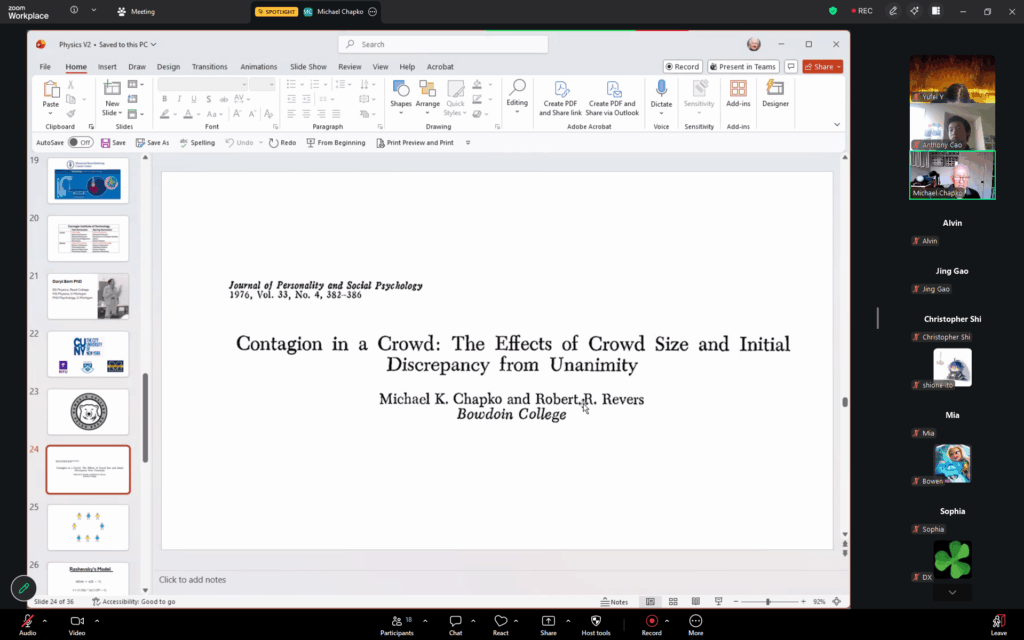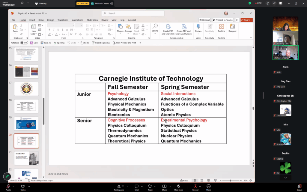 In the seminar, guest speaker Michael Chapko explained his education, research, and reasoning for the aforementioned topics. The seminar covered his choice for physics and switch to psychology, as well as how he used his physics and math knowledge on his research on a variety of topics, including epidemiology and psychology of crowds. The participants and host/cohost asked questions about his experiences of studying physics and changing a major, and what he would recommend to students who are interested in either field.