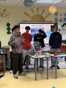 Next, we introduced the students to some robotics competitions they could participate in, both currently and in the future, such as lego robotics, first robotics, and vex. We showcased some cool robots, explained past games, and answered many insightful questions the students had, such as if certain designs they had just thought of would be effective. We also explained how the example robots we brought in worked and how they were designed, such as how they played the game and moved around.