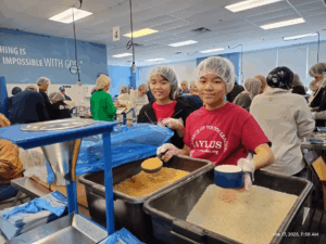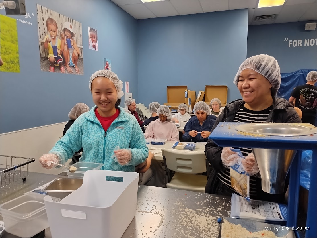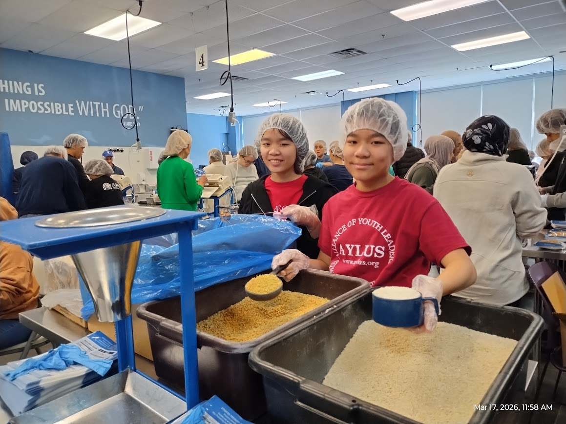 On Tuesday, March 17, 2026, volunteers from AYLUS Frisco and Plano Branch volunteered at Feed My Starving Children (FMSC), a nonprofit organization that helps starving kids and their families in need around the world. During the 11:30 AM session, we worked at different positions at the table to pack MannaPack Rice, which consists of multiple nutritious foods such as vitamins, vegetables, soy, and rice.