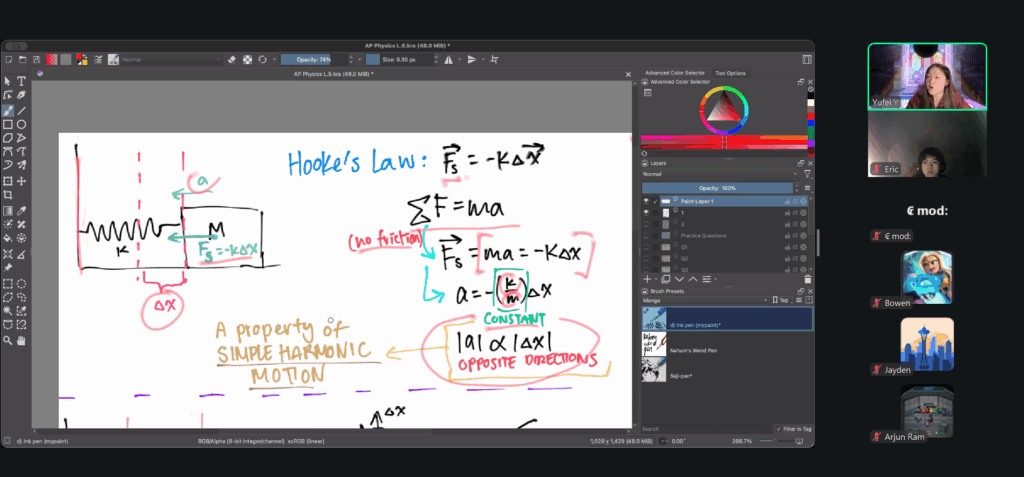 In our fifth and final lesson, students reviewed simple harmonic motion with springs and pendulums, and went over multiple review problems. Students were able to engage in discussion with instructors about the topics taught, and work together to solve practice problems.