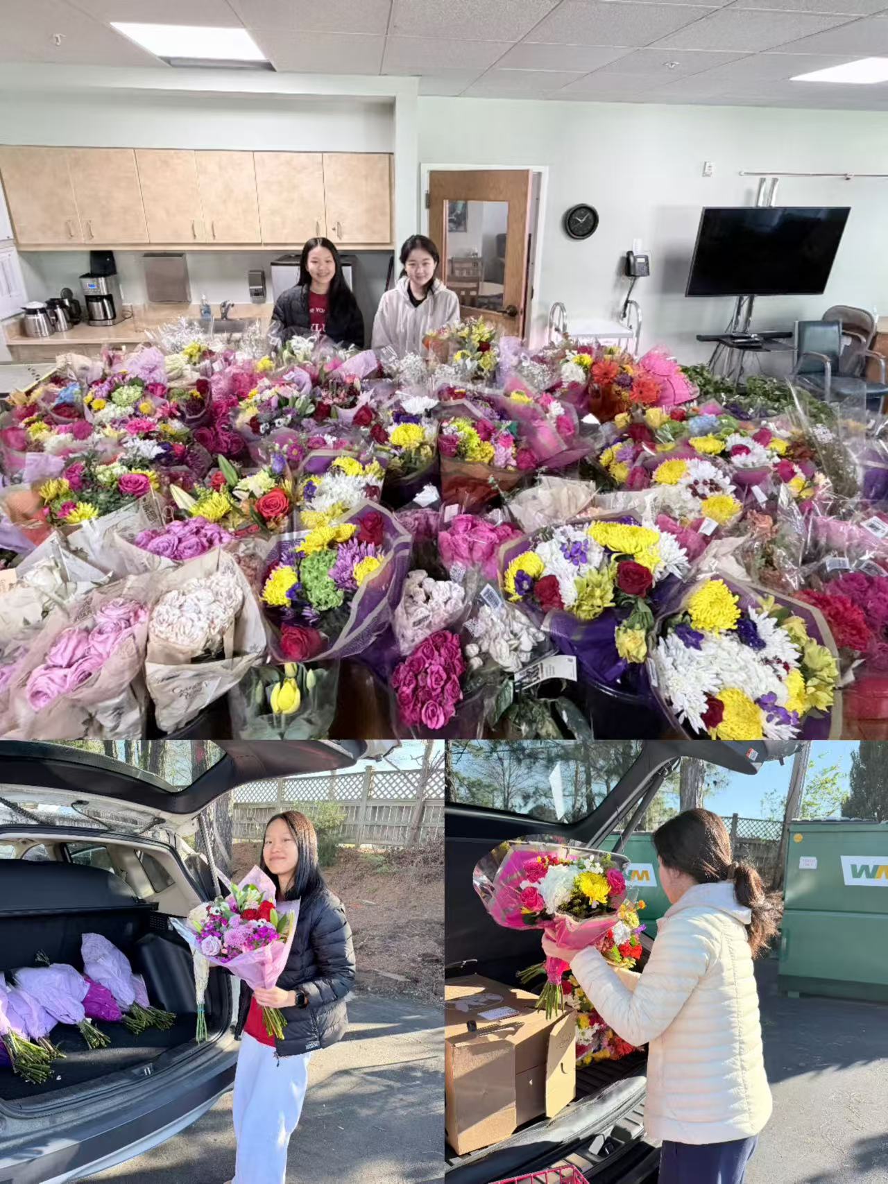 Volunteers Selena Wang and Irena Gao worked together to carefully gather the blooms and transport them to Charles House, a nonprofit organization that provides enriching care for seniors and those with dementia within the Carol Woods Retirement Community. The flowers will be used by the senior residents in their beloved flower arrangement activities, offering a joyful and creative outlet that brightens both their mornings and their living spaces.