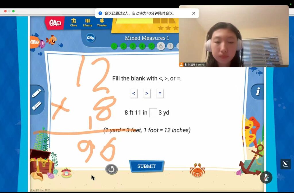 Serena Liu taught Level 2 Beast Academy curriculum for 2.0 hrs on March 27, 2026
