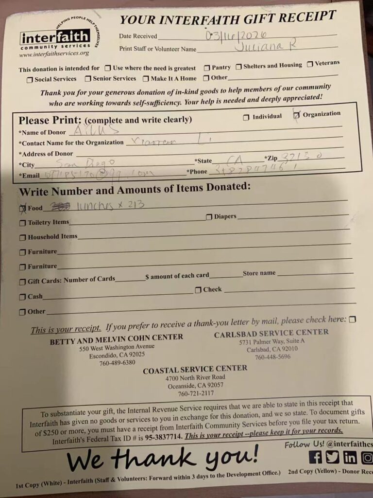 On March 16, 2026, AYLUS San Diego Branch made sack lunches for Interfaith Community Services.