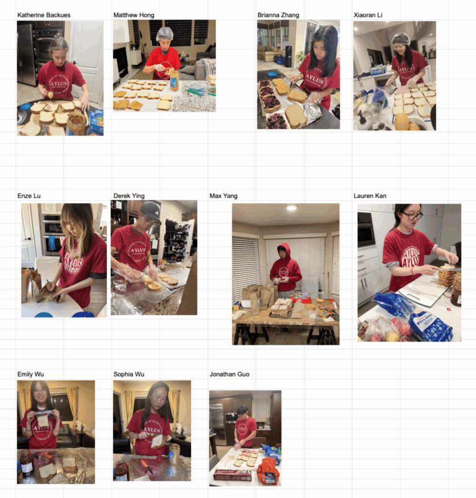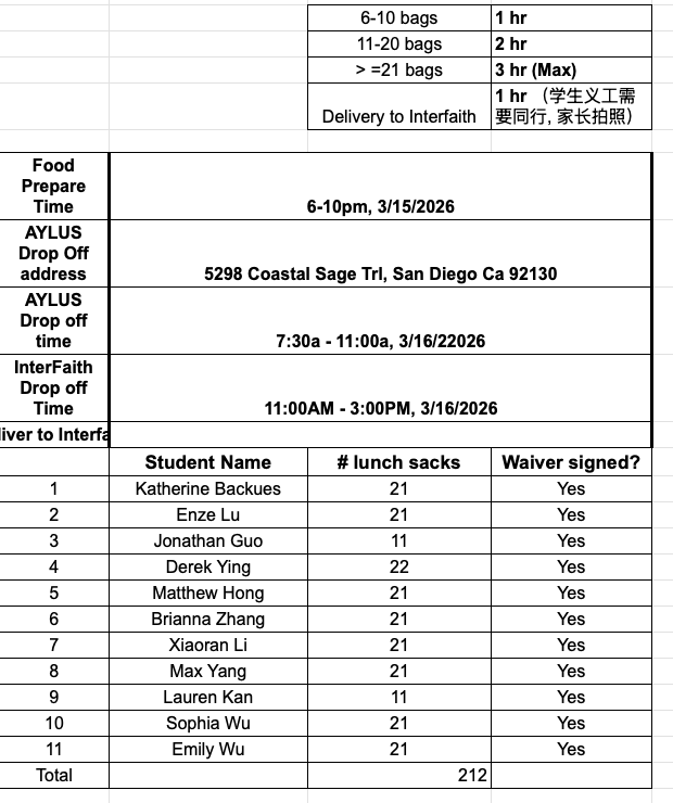 The following 11 AYLUS volunteers participated and made 212 sack lunches 3/16/2026 and delivered all of them to Interfaith Community Services on the day:
