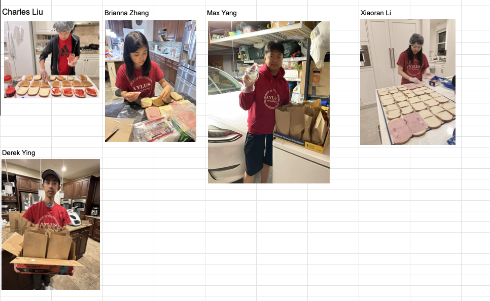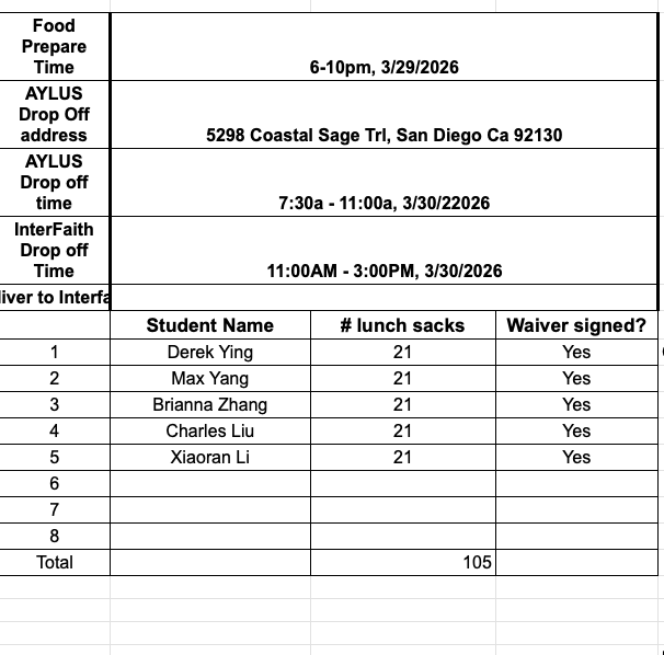 The following 5 AYLUS volunteers participated and made 105 sack lunches 3/30/2026 and delivered all of them to Interfaith Community Services on the day: