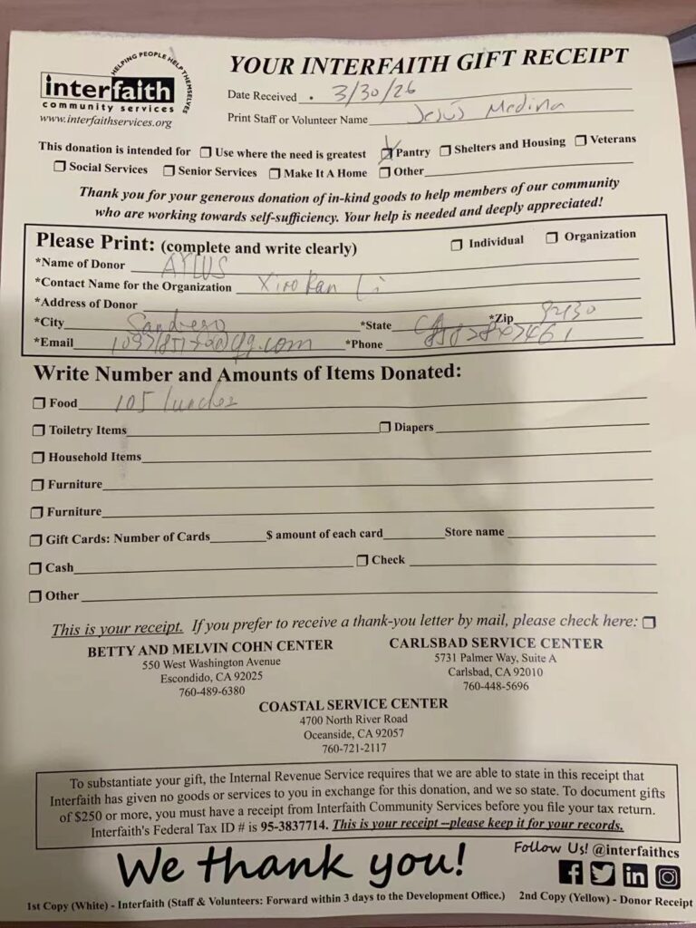 On March 30, 2026, AYLUS San Diego Branch made sack lunches for Interfaith Community Services.