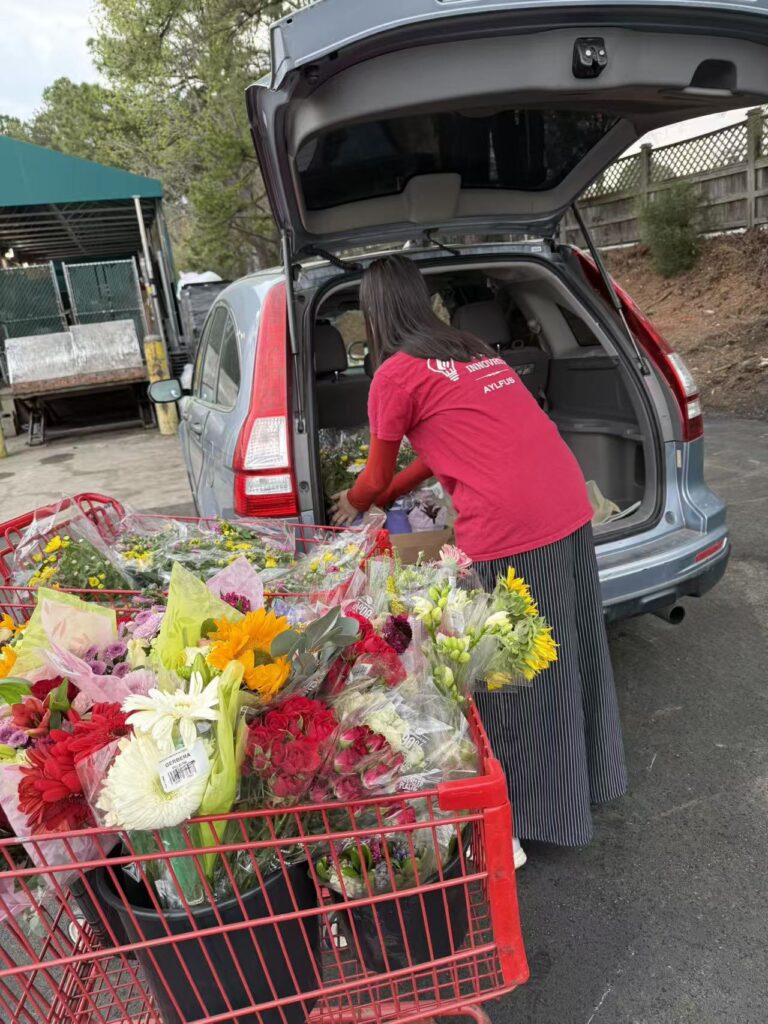 On March 22nd, 2026, two members of the AYLUS Chapel Hill Branch spent their morning picking up and delivering fresh flowers donated by Trader Joe’s to Charles House in Chapel Hill.