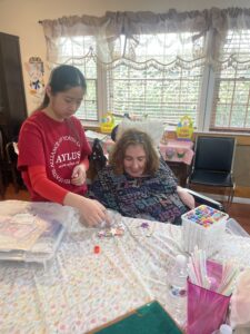 While waiting for the cookies to bake, in the meantime we decided to do some arts and crafts. Since Easter was coming up, we brought some easter egg shaped wooden stencils. We helped the residents to color and decorate their wooden easter eggs with lots of colors. The eggs turned out great, and everyone had a really fun time.