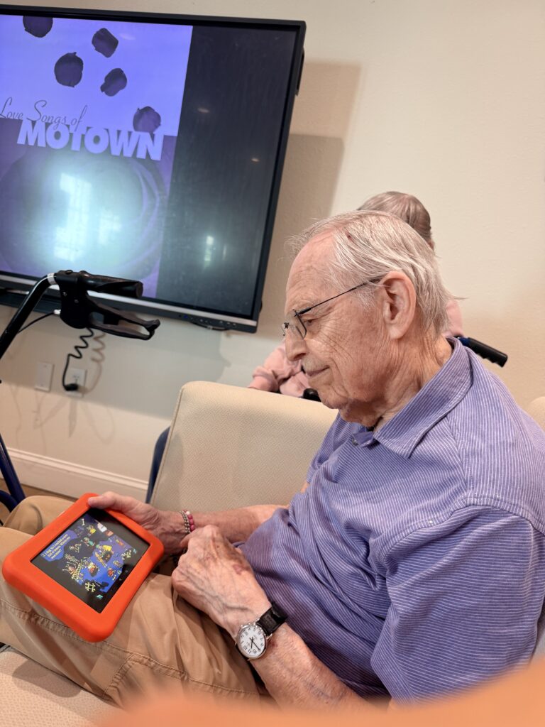 For this visit, our team borrowed a memory-based video game system from a local library. The game, designed at a children’s level, was especially well-suited for elderly residents in memory care, providing an accessible and enjoyable way to participate. Volunteers guided residents through the games, helping them learn how to play and encouraging active involvement.
